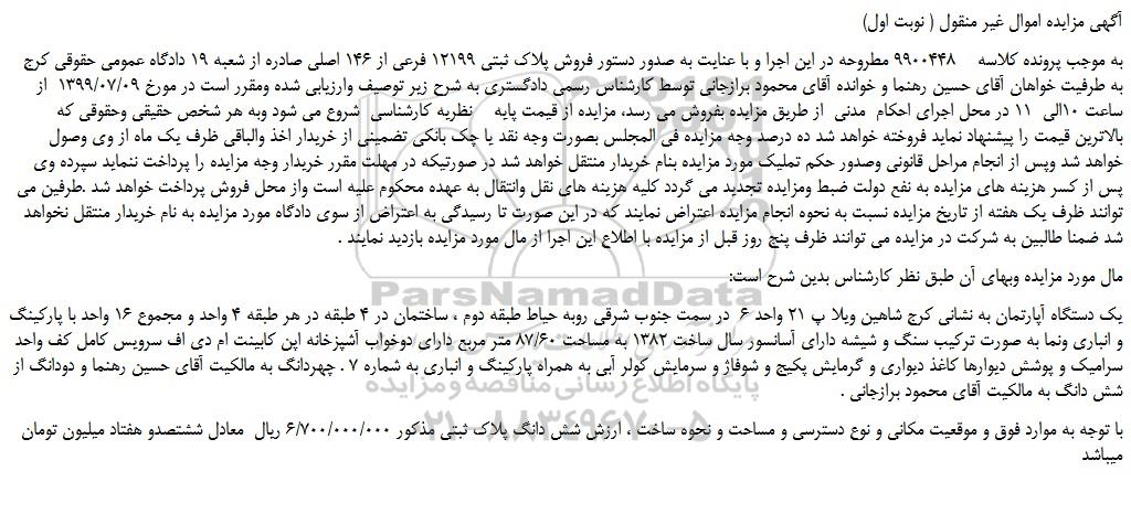 به موجب پرونده کلاسه 9900448 مطروحه در این اجرا و با عنایت به صدور دستور فروش پلاک ثبتی 12199 فرعی از 146 اصلی صادره از شعبه 19 دادگاه عمومی حقوقی کرج به طرفیت خواهان آقای حسین رهنما و خوانده آقای محمود برازجانی توسط کارشناس رسمی دادگستری به شرح زیر توصیف وارزیابی شده ومقرر است در مورخ 1399/07/09 از ساعت 10الی 11 در محل اجرای احکام مدنی از طریق مزایده بفروش می رسد، مزایده از قیمت پایه نظریه کارشناسی شروع می شود وبه هر شخص حقیقی وحقوقی که بالاترین قیمت را پیشنهاد نماید فروخته خواهد شد ده درصد وجه مزایده فی المجلس بصورت وجه نقد یا چک بانکی تضمینی از خریدار اخذ والباقی ظرف یک ماه از وی وصول خواهد شد وپس از انجام مراحل قانونی وصدور حکم تملیک مورد مزایده بنام خریدار منتقل خواهد شد در صورتیکه در مهلت مقرر خریدار وجه مزایده را پرداخت ننماید سپرده وی پس از کسر هزینه های مزایده به نفع دولت ضبط ومزایده تجدید می گردد کلیه هزینه های نقل وانتقال به عهده محکوم علیه است واز محل فروش پرداخت خواهد شد .طرفین می توانند ظرف یک هفته از تاریخ مزایده نسبت به نحوه انجام مزایده اعتراض نمایند که در این صورت تا رسیدگی به اعتراض از سوی دادگاه مورد مزایده به نام خریدار منتقل نخواهد شد ضمنا طالبین به شرکت در مزایده می توانند ظرف پنج روز قبل از مزایده با اطلاع این اجرا از مال مورد مزایده بازدید نمایند .