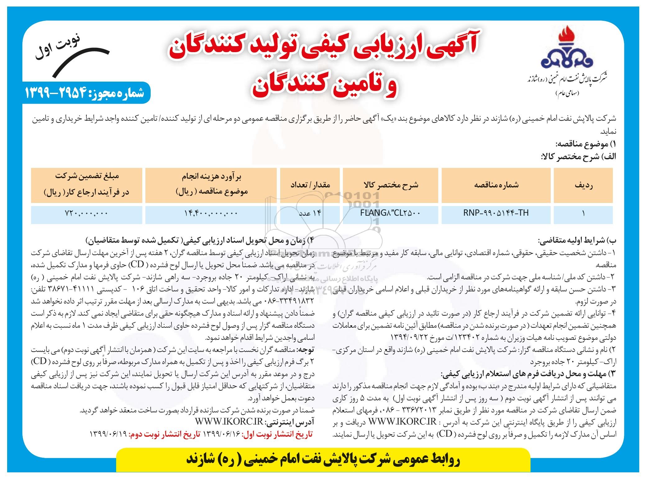 ارزیابی کیفی FLANG 8" CL2500, آگهی ارزیابی کیفی , ارزیابی کیفی FLANG 8" CL2500