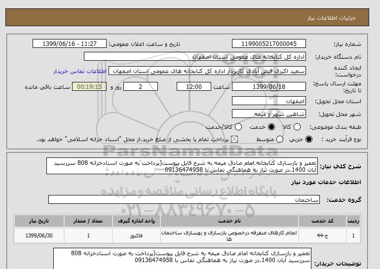 توضیحات خریدارتعمیر و بازسازی کتابخانه امام صادق میمه به شرح فایل پیوست(پرداخت به صورت اسنادخزانه 808 سررسید آبان 1400.در صورت نیاز به هماهنگی تماس با 09136474958