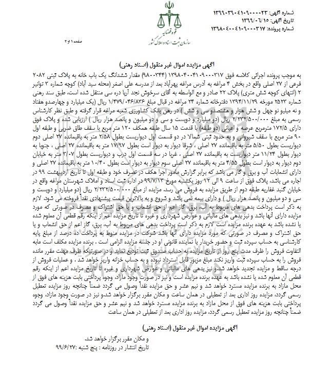 مزایده ششدانگ یکباب خانه پلاک ثبتی 2082 فرعی کلاسه 9800344