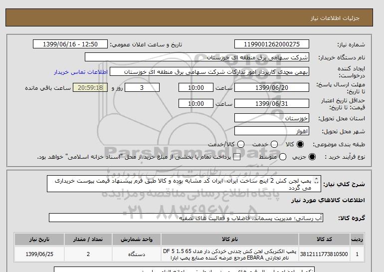 شرح کلی نیاز: پمپ لجن کش 2 اینچ ساخت ایران ایران کد مشابه بوده و کالا طبق فرم پیشنهاد قیمت پیوست خریداری می گردد