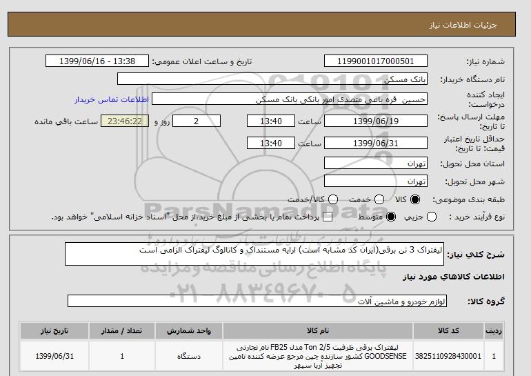 شرح کلی نیاز: لیفتراک 3 تن برقی(ایران کد مشابه است) ارایه مستنداک و کاتالوگ لیفتراک الزامی است