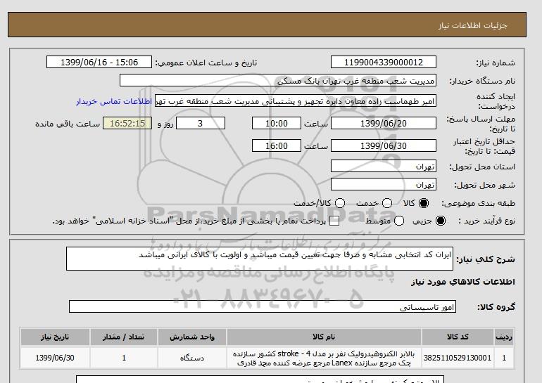 شرح کلی نیاز: ایران کد انتخابی مشابه و صرفا جهت تعیین قیمت میباشد و اولویت با کالای ایرانی میباشد