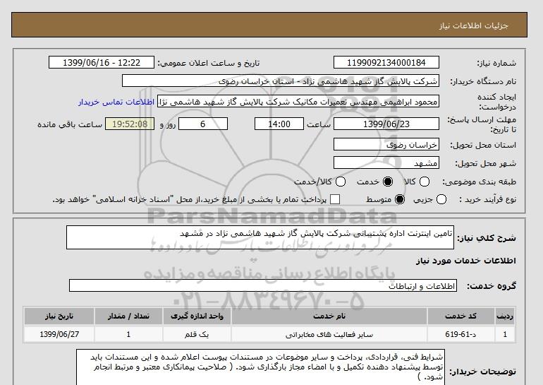 شرح کلی نیاز: تامین اینترنت اداره پشتیبانی شرکت پالایش گاز شهید هاشمی نژاد در مشهد