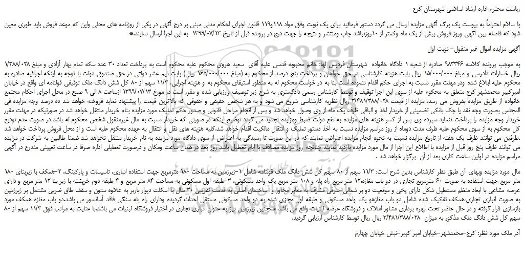 به موجب پرونده کلاسه 983346 صادره از شعبه 1 دادگاه خانواده شهرستان فردیس لها: خانم محبوبه قدسی علیه آقای سعید هروی محکوم علیه محکوم است به پرداخت تعداد 30 عدد سکه تمام بهار آزادی و مبلغ 1/388/028 ریال خسارات دادرسی و مبلغ 15/000/000 ریال بابت هزینه کارشناسی در حق خواهان و پرداخت پنج درصد از محکوم به (مبلغ 165/000/000 ریال) بابت نیم عشر دولتی در حق صندوق دولت با توجه به اینکه اجرائیه صادره به محکوم علیه ابلاغ شده ودر مهلت مقرر نسبت به اجرای حکم اقدام ننموده است بنا به در خواست محکوم له به منظور استیفای محکوم به و هزینه اجرایی، 11/3 سهم از 80 کل شش دانگ ملک توقیفی قولنامه ای واقع در خیابان امیرکبیر محمدشهر کرج متعلق به محکوم علیه از سوی این اجرا توقیف و توسط کارشناس رسمی دادگستری به شرح زیر توصیف وارزیابی شده و مقرر است در مورخ 1399/07/13 ازساعت 8 الی 9 صبح در محل اجرای احکام مجتمع خانواده از طریق مزایده بفروش می رسد، مزایده از قیمت 3/481/388/028 ریال نظریه کارشناسی شروع می شود و به هر شخص حقیقی و حقوقی که بالاترین قیمت را پیشنهاد نماید فروخته خواهد شد ده درصد وجه مزایده فی المجلس بصورت وجه نقد یا چک بانکی تضمینی از خریدار اخذ و الباقی ظرف یک ماه از وی وصول خواهد شد و پس از انجام مراحل قانونی و صدور حکم تملیک مورد مزایده بنام خریدار منتقل خواهد شد در صورتیکه در مهلت مقرر خریدار وجه مزایده را پرداخت ننماید سپرده وی پس از کسر هزینه های مزایده به نفع دولت ضبط ومزایده تجدید می گردد توضیح اینکه در صورتی که خریدار نسبت به مال غیرمنقول شخص محکوم له باشد در صورت عدم تودیع کل محکوم به از سوی محکوم علیه ظرف مدت دوماه از روز مراسم مزایده نسبت به اخذ دستور تملیک و انتقال مالکیت اقدام خواهد شد.کلیه هزینه های نقل و انتقال به عهده محکوم علیه است و از محل فروش پرداخت خواهد شد .طرفین می توانند ظرف یک هفته از تاریخ مزایده نسبت به نحوه انجام مزایده اعتراض نمایند که در این صورت تا رسیدگی به اعتراض از سوی دادگاه مورد مزایده به نام خریدار منتقل نخواهد شد ضمنا طالبین به شرکت در مزایده می توانند ظرف پنج روز قبل از مزایده با اطلاع این اجرا از مال مورد مزایده بازدید نمایند چنانچه روز مزایده مصادف با ایام تعطیل باشد روز بعد در همان ساعت ومکان و درصورت تعطیلی اداره صرفا در ساعت تعیینی مندرج در آگهی مراسم مزایده در اولین ساعت کاری بعد از آن برگزار خواهد شد .