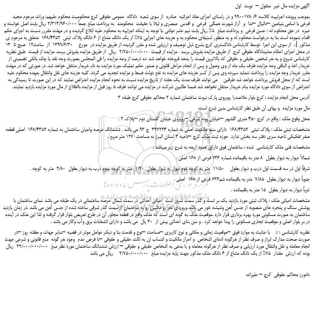 بموجب پرونده اجراییبه کلاسه 6/ 9900178 و در راستای اجرای مفاد اجرائیه صادره از سوی شعبه دادگاه عمومی حقوقی کرج محکومیت محکوم علیهم: وراث مرحوم مجید فرخی با اسامی بنیامین –دانیال –ندا و آراز شهرت همگی فرخی و اقدس مبصری و لیلا با حقیقت محکومند به پرداخت مبلغ جمعاً 2/313/960/000 ریال بابت اصل خواسته و غیره در حق محکوم له : حسن فرخی و پرداخت مبلغ 5% ریال بابت نیم عشر دولتی .با توجه به اینکه اجراییه به محکوم علیه ابلاغ گردیده و در مهلت مقررر نسبت به اجرای حکم اقدام ننموده است بنا به درخواست محکوم له و به منظور استیفای محکوم به و هزینه های اجرایی 75% از یک دانگ مشاع از 6 دانگ پلاک ثبتی 168/4352 متعلق به مرحوم ی مذکور |، از سوی این اجرا توسط کارشناس دادگستری کرج بشرح ذیل توصیف و ارزیابی شده و مقرر گردیده از طریق مزایده در مورخ 1399/6/30 از ساعت12 صبح تا 13 در محل اجرای احکام مدنیدادگاه حقوقی کرج از طریق مزایده بفروش برسد . مزایده از قیمت 2/750/000/000 ریال از طریق مزایده بفروش برسد. مزایده از قیمت طبق نظریه کارشناس شروع و به هر شخص حقیقی و حقوقی که بالاترین قیمت را بدهد فروخته خواهد شد. ده درصد از وجه مزایده را فی المجلس بصورت وجه نقد یا چک بانکی تضمینی از خریدار اخذ و الباقی وجه مزایده ظرف یک ماه از وی وصول و پس از انجام مراحل قانونی و صدور حکم تملیک مورد مزایده به نام خریدار منتقل خواهد شد. در صورتی که در مهلت مقرر خریدار وجه مزایده را پرداخت ننماید سپرده وی پس از کسر هزینه های مزایده به نفع دولت ضبط و مزایده تجدید می گردد. کلیه هزینه های نقل وانتقال بعهده محکوم علیه است که از محل فروش پرداخت خواهد شد طرفین می توانند ظرف مدت یک هفته از تاریخ مزایده نسبت به نحوه انجام مزایده اعتراض نمایند که در این صورت تا رسیدگی به اعتراض از سوی دادگاه مورد مزایده بنام خریدار منتقل نخواهد شد ضمنا طالبین شرکت در مزایده می توانند ظرف 5 روز قبل از مزایده بااطلاع از مال مورد مزایده بازدید نمایند.
