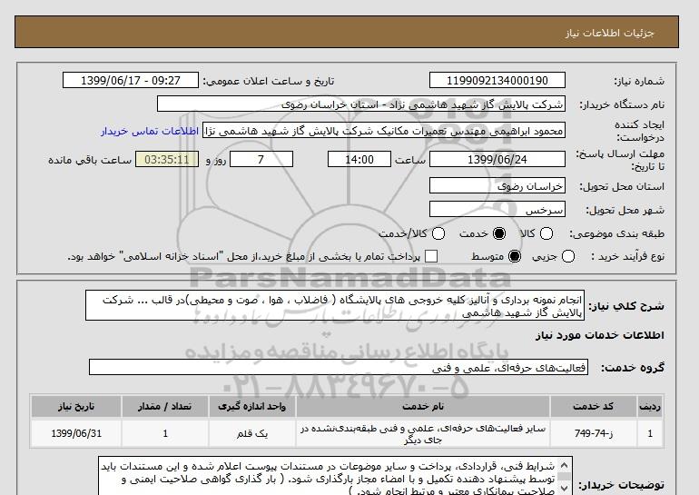 شرح کلی نیاز: انجام نمونه برداری و آنالیز کلیه خروجی های پالایشگاه ( فاضلاب ، هوا ، صوت و محیطی)در قالب ... شرکت پالایش گاز شهید هاشمی