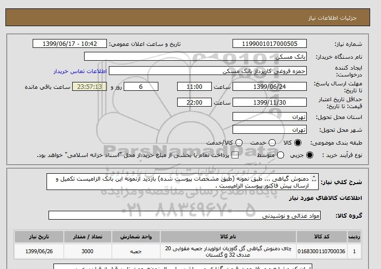 استعلام دمنوش گیاهی ... طبق نمونه (طبق مشخصات پیوست شده) بازدید ازنمونه این بانک الزامیست تکمیل و ارسال پیش فاکتور پیوست الزامیست . شماره فکس 26205036 , استعلام دمنوش گیاهی ... طبق نمونه (طبق مشخصات پیوست شده) بازدید ازنمونه این بانک الزامیست تکمیل و ارسال پیش فاکتور پیوست الزامیست . شماره فکس 26205036