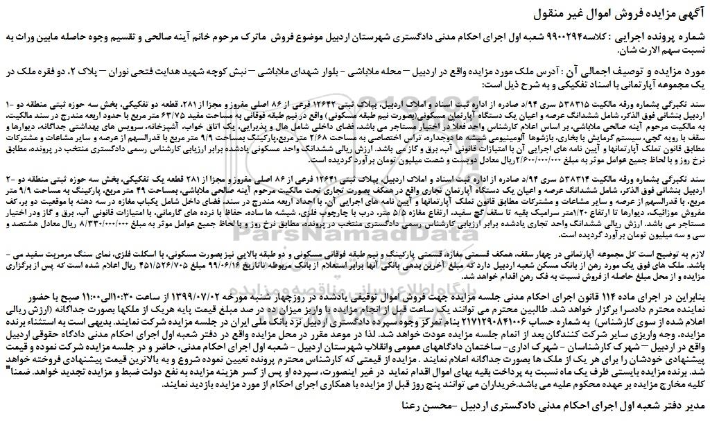 1- سند تکبرگی بشماره ورقه مالکیت 538315 سری 94/د صادره از اداره ثبت اسناد و املاک اردبیل، بپلاک ثبتی 12642 فرعی از 86 اصلی مفروز و مجزا از 281، قطعه دو تفکیکی، بخش سه حوزه ثبتی منطقه دو اردبیل بنشانی فوق الذکر، شامل ششدانگ عرصه و اعیان یک دستگاه آپارتمان مسکونی(بصورت نیم طبقه مسکونی) واقع در نیم طبقه فوقانی به مساحت مفید 63/75 متر مربع با حدود اربعه مندرج در سند مالکیت، به مالکیت مرحوم آینه صالحی ملاباشی، بر اساس اعلام کارشناس واحد فعلاً در اختیار مستاجر می باشد، فضای داخلی شامل هال و پذیرایی، یک اتاق خواب، آشپزخانه، سرویس های بهداشتی جداگانه، دیوارها و سقف با رویه گچی، سیستم گرمایش با بخاری، بازشوها آلومینیومی شیشه ها دوجداره، تراس اختصاصی به مساحت 2/68 متر مربع،پارکینگ بمساحت 9/9 متر مربع با قدرالسهم از عرصه و سایر مشاعات و مشترکات مطابق قانون تملک آپارتمانها و آیین نامه های اجرایی آن با امتیازات قانونی آب، برق و گاز می باشد. ارزش ریالی ششدانگ واحد مسکونی یادشده برابر ارزیابی کارشناس رسمی دادگستری منتخب در پرونده، مطابق نرخ روز و با لحاظ جمیع عوامل موثر به مبلغ 2/600/000/000ریال معادل دویست و شصت میلیون تومان برآورد گردیده است.