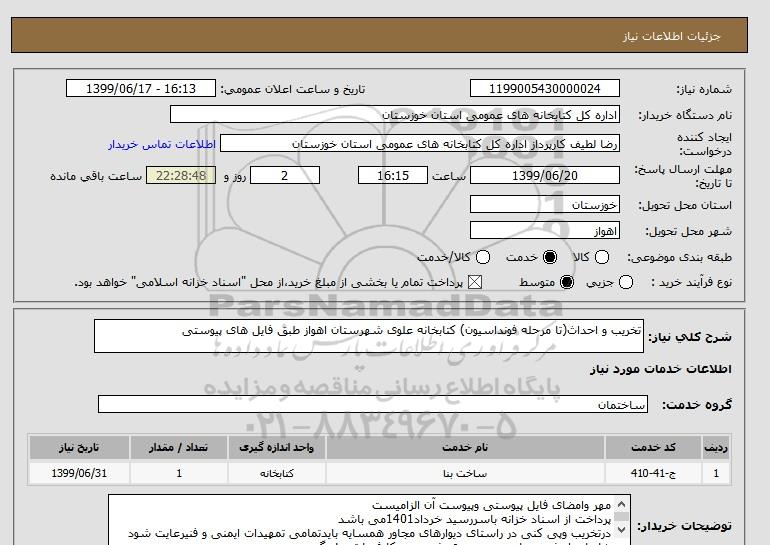شرح کلی نیاز: تخریب و احداث(تا مرحله فونداسیون) کتابخانه علوی شهرستان اهواز طبق فایل های پیوستی
