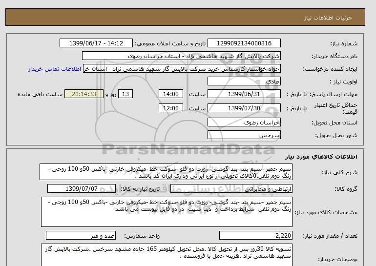 نام دستگاه خریدار:شرکت پالایش گاز شهید هاشمی نژاد - استان خراسان رضوی
