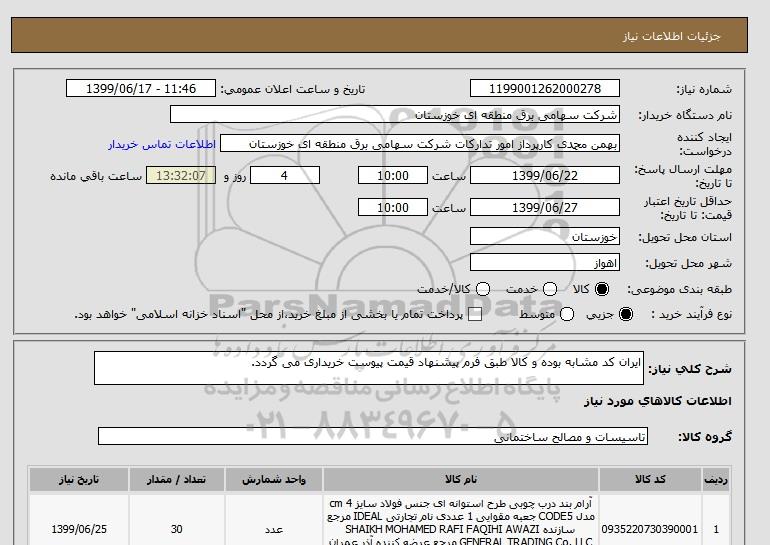 شرح کلی نیاز: ایران کد مشابه بوده و کالا طبق فرم پیشنهاد قیمت پیوست خریداری می گردد.