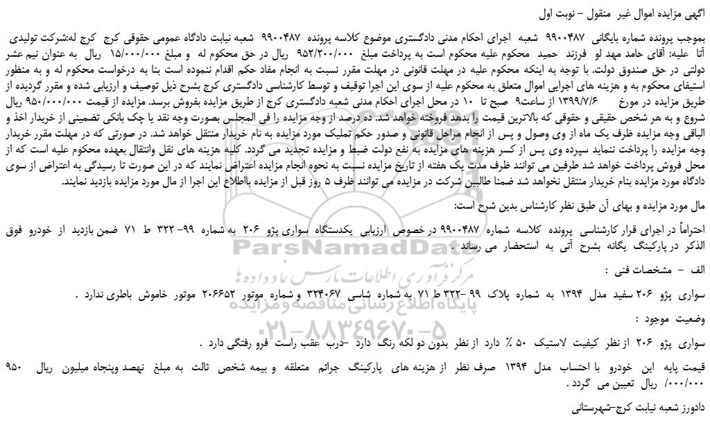 بموجب پرونده شماره بایگانی 9900487 شعبه اجرای احکام مدنی دادگستری موضوع کلاسه پرونده 9900487 شعبه نیابت دادگاه عمومی حقوقی کرج کرج له:شرکت تولیدی آتا علیه: آقای حامد مهد لو فرزند حمید محکوم علیه محکوم است به پرداخت مبلغ 952/200/000 ریال در حق محکوم له و مبلغ 15/000/000 ریال به عنوان نیم عشر دولتی در حق صندوق دولت. با توجه به اینکه محکوم علیه در مهلت قانونی در مهلت مقرر نسبت به انجام مفاد حکم اقدام ننموده است بنا به درخواست محکوم له و به منظور استیفای محکوم به و هزینه های اجرایی اموال متعلق به محکوم علیه از سوی این اجرا توقیف و توسط کارشناسی دادگستری کرج بشرح ذیل توصیف و ارزیابی شده و مقرر گردیده از طریق مزایده در مورخ 1399/7/6 از ساعت9 صبح تا 10 در محل اجرای احکام مدنی شعبه دادگستری کرج از طریق مزایده بفروش برسد. مزایده از قیمت 950/000/000 ریال شروع و به هر شخص حقیقی و حقوقی که بالاترین قیمت را بدهد فروخته خواهد شد. ده درصد از وجه مزایده را فی المجلس بصورت وجه نقد یا چک بانکی تضمینی از خریدار اخذ و الباقی وجه مزایده ظرف یک ماه از وی وصول و پس از انجام مراحل قانونی و صدور حکم تملیک مورد مزایده به نام خریدار منتقل خواهد شد. در صورتی که در مهلت مقرر خریدار وجه مزایده را پرداخت ننماید سپرده وی پس از کسر هزینه های مزایده به نفع دولت ضبط و مزایده تجدید می گردد. کلیه هزینه های نقل وانتقال بعهده محکوم علیه است که از محل فروش پرداخت خواهد شد طرفین می توانند ظرف مدت یک هفته از تاریخ مزایده نسبت به نحوه انجام مزایده اعتراض نمایند که در این صورت تا رسیدگی به اعتراض از سوی دادگاه مورد مزایده بنام خریدار منتقل نخواهد شد ضمنا طالبین شرکت در مزایده می توانند ظرف 5 روز قبل از مزایده بااطلاع این اجرا از مال مورد مزایده بازدید نمایند.