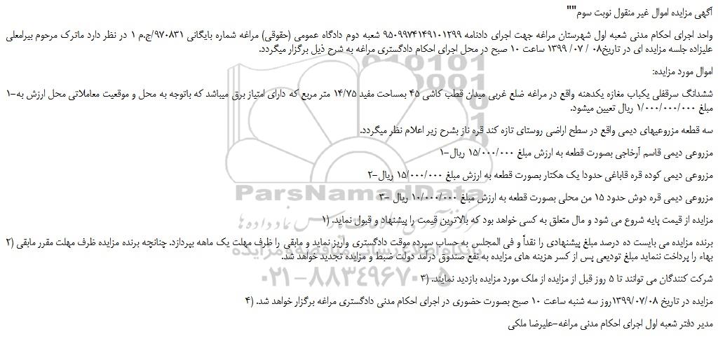 واحد اجرای احکام مدنی شعبه اول شهرستان مراغه جهت اجرای دادنامه 9509974149101299 شعبه دوم دادگاه عمومی (حقوقی) مراغه شماره بایگانی 970831/ج.م 1 در نظر دارد ماترک مرحوم بیرامعلی علیزاده جلسه مزایده ای در تاریخ08 / 07/ 1399 ساعت 10 صبح در محل اجرای احکام دادگستری مراغه به شرح ذیل برگزار میگردد.