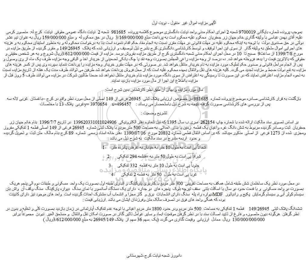 بموجب پرونده شماره بایگانی 9700019 شعبه 2 اجرای احکام مدنی واحد نیابت دادگستری موضوع کلاسه پرونده  981685  شعبه 2  نیابت دادگاه عمومی حقوقی  نیابت  کرج له:  منصور کرمی علیه: آقای بهمن عباسی با وثیقه گذاری خانم جهان زر جعفریان  محکوم علیه محکوم است به پرداخت مبلغ 3/169/000/000  ریال در حق محکوم له  و مبلغ 159/000/000 ریال به عنوان نیم عشر دولتی در حق صندوق دولت  با توجه به اینکه محکوم علیه در مهلت قانونی در مهلت مقرر نسبت به انجام مفاد حکم اقدام ننموده است بنا به درخواست محکوم له و به منظور استیفای محکوم به و هزینه های اجرایی اموال متعلق به وثیقه گذار  از سوی این اجرا توقیف و توسط کارشناسی دادگستری کرج بشرح ذیل توصیف و ارزیابی شده که پلاک  149/26945 و مقرر گردیده از طریق مزایده در مورخ 1399/7/8 از ساعت9  صبح تا  10 در محل اجرای احکام مدنی شعبه دادگستری کرج از طریق مزایده بفروش برسد. مزایده از قیمت 3/612/000/000ریال شروع و به هر شخص حقیقی و حقوقی که بالاترین قیمت را بدهد فروخته خواهد شد. ده درصد از وجه مزایده را فی المجلس بصورت وجه نقد یا چک بانکی تضمینی از خریدار اخذ و الباقی وجه مزایده ظرف یک ماه از وی وصول و پس از انجام مراحل قانونی و صدور حکم تملیک مورد مزایده به نام خریدار منتقل خواهد شد. در صورتی که در مهلت مقرر خریدار وجه مزایده را پرداخت ننماید سپرده وی پس از کسر هزینه های مزایده به نفع دولت ضبط و مزایده تجدید می گردد. کلیه هزینه های نقل وانتقال بعهده محکوم علیه است که از محل فروش پرداخت خواهد شد طرفین می توانند ظرف مدت یک هفته از تاریخ مزایده نسبت به نحوه انجام مزایده اعتراض نمایند که در این صورت تا رسیدگی به اعتراض از سوی دادگاه مورد مزایده بنام خریدار منتقل نخواهد شد ضمنا طالبین شرکت در مزایده می توانند ظرف 5 روز قبل از مزایده بااطلاع این اجرا از مال مورد مزایده بازدید نمایند.