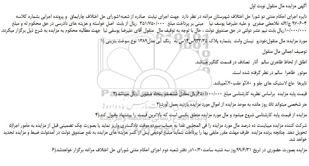 1) مورد مزایده: مال منقول:خودرو نیسان وانت بشماره پلاک 933/35س14س به رنگ آبی مدل1389 نوع سوخت بنزینی