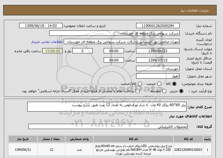 شرح کلی نیاز: پنل 60*60 روکار 40 وات با شار نوری لومن به تعداد 12 عدد طبق شرح پیوست