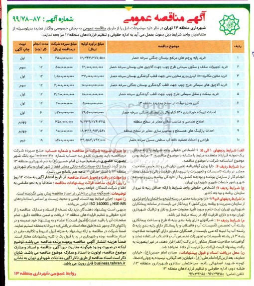 | 2 | خرید تجهیزات سقف و سکوی سیمانی طرح چوب جهت آلاچیق های بوستان سرخه حصار | 12.000.000.000 | 500.000.000 | 12 | سوم |