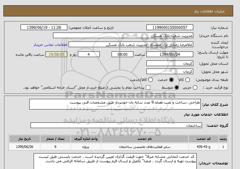 شرح کلی نیاز: طراحی ،ساخت و نصب تعداد 9 عدد سایه بان خودپرداز طبق مشخصات فنی پیوست