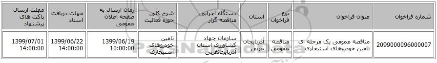 2099000096000007مناقصه عمومی یک مرحله ای تامین خودروهای استیجاری مناقصه عمومیآذربایجان غربیسازمان جهاد کشاورزی استان آذربایجانغربیتامین خودروهای استیجاری 1399/06/19 10:00:001399/06/22 14:00:001399/07/01 14:00:00