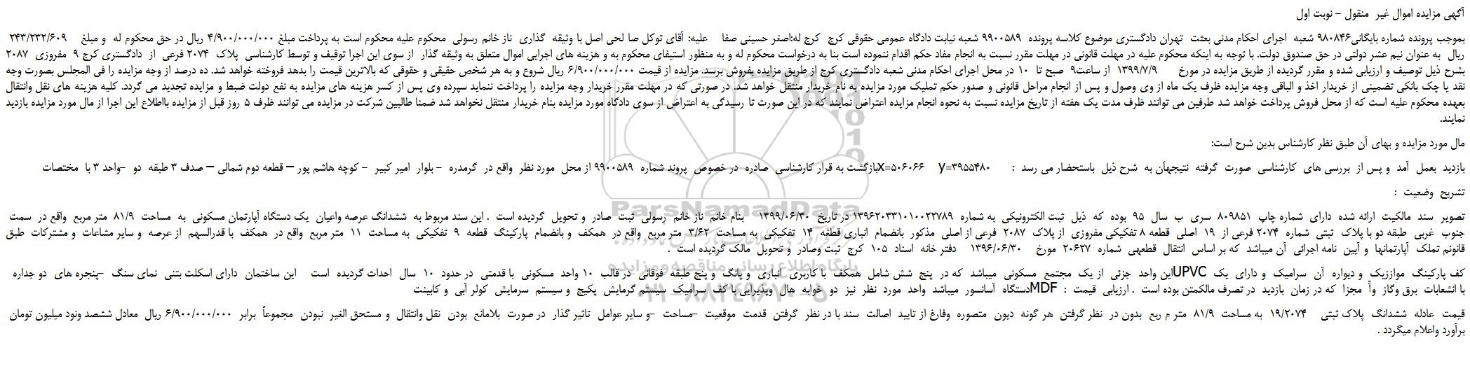 بموجب پرونده شماره بایگانی980846 شعبه اجرای احکام مدنی بعثت تهران دادگستری موضوع کلاسه پرونده 9900589 شعبه نیابت دادگاه عمومی حقوقی کرج کرج له:اصغر حسینی صفا علیه: آقای توکل صا لحی اصل با وثیقه گذاری ناز خانم رسولی محکوم علیه محکوم است به پرداخت مبلغ 4/900/000/000 ریال در حق محکوم له و مبلغ 243/232/609 ریال به عنوان نیم عشر دولتی در حق صندوق دولت. با توجه به اینکه محکوم علیه در مهلت قانونی در مهلت مقرر نسبت به انجام مفاد حکم اقدام ننموده است بنا به درخواست محکوم له و به منظور استیفای محکوم به و هزینه های اجرایی اموال متعلق به وثیقه گذار از سوی این اجرا توقیف و توسط کارشناسی پلاک 2074 فرعی از دادگستری کرج 9 مفروزی 2087 بشرح ذیل توصیف و ارزیابی شده و مقرر گردیده از طریق مزایده در مورخ 1399/7/9 از ساعت9 صبح تا 10 در محل اجرای احکام مدنی شعبه دادگستری کرج از طریق مزایده بفروش برسد. مزایده از قیمت 6/900/000/000 ریال شروع و به هر شخص حقیقی و حقوقی که بالاترین قیمت را بدهد فروخته خواهد شد. ده درصد از وجه مزایده را فی المجلس بصورت وجه نقد یا چک بانکی تضمینی از خریدار اخذ و الباقی وجه مزایده ظرف یک ماه از وی وصول و پس از انجام مراحل قانونی و صدور حکم تملیک مورد مزایده به نام خریدار منتقل خواهد شد. در صورتی که در مهلت مقرر خریدار وجه مزایده را پرداخت ننماید سپرده وی پس از کسر هزینه های مزایده به نفع دولت ضبط و مزایده تجدید می گردد. کلیه هزینه های نقل وانتقال بعهده محکوم علیه است که از محل فروش پرداخت خواهد شد طرفین می توانند ظرف مدت یک هفته از تاریخ مزایده نسبت به نحوه انجام مزایده اعتراض نمایند که در این صورت تا رسیدگی به اعتراض از سوی دادگاه مورد مزایده بنام خریدار منتقل نخواهد شد ضمنا طالبین شرکت در مزایده می توانند ظرف 5 روز قبل از مزایده بااطلاع این اجرا از مال مورد مزایده بازدید نمایند.