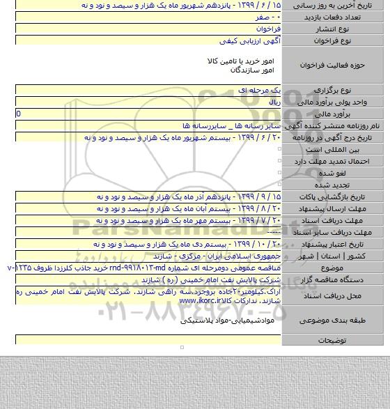 مناقصه عمومی دومرحله ای شماره rnd-۹۹۱۸۰۱۳-md خرید جاذب کلرزدا ظروف v-۱۲۳۵