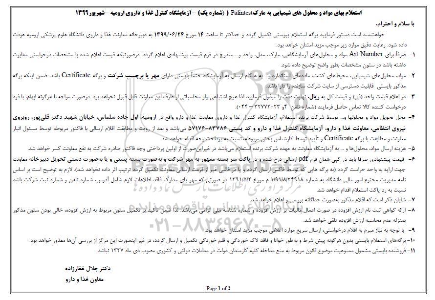 استعلام بهای مواد و محلول های شیمیایی به مارک palintest - آزمایشگاه کنترل غذا و داروی ارومیه شهریور 99 ؟