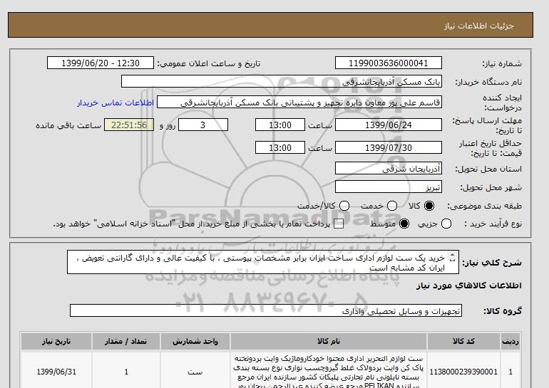 شرح کلی نیاز: خرید یک ست لوازم اداری ساخت ایران برابر مشخصات پیوستی ، با کیفیت عالی و دارای گارانتی تعویض ، ایران کد مشابه است