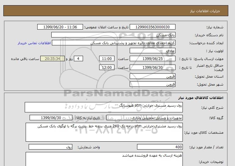مشخصات کالای مورد نیاز: رول رسید مشتری حرارتی atm درجه یک 240 متری بدونه خط .پشت برگه با لوگوی بانک مسکن