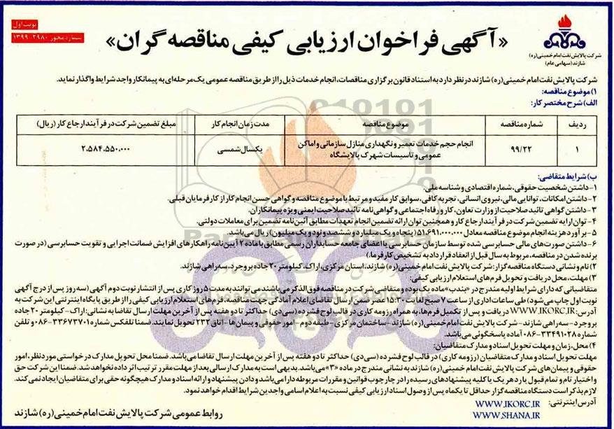 | 99/22 | انجام خدمات خدمات تعمیر و نگهداری منازل سازمانی و اماکن عمومی و تاسیسات شهرک پالایشگاه | یکسال شمسی | 2.584.550.000 |