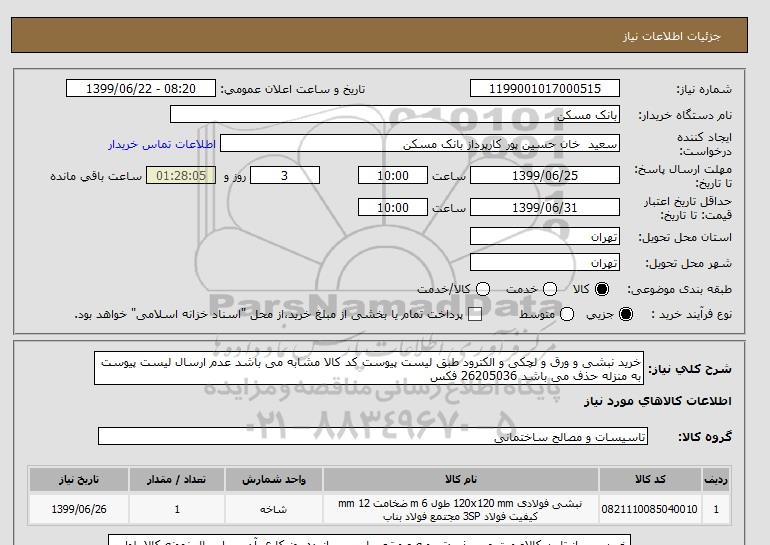 شرح کلی نیاز: خرید نبشی و ورق و لچکی و الکترود طبق لیست پیوست کد کالا مشابه می باشد عدم ارسال لیست پیوست به منزله حذف می باشد 26205036 فکس