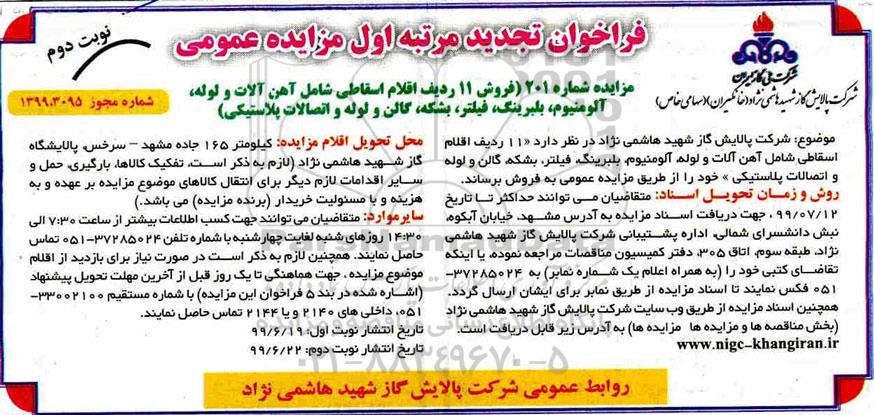 موضوع: شرکت پالایش گاز شهید هاشمی نژاد در نظر دارد 11 ردیف اقلام اسقاط شامل آهن آلات و لوله، آلومینوم، بلبرینگ، فیلتر، بشکه، گالن و لوله و اتصالات پلاستیکی) خود را از طریق مزایده عمومی به فروش برساند.