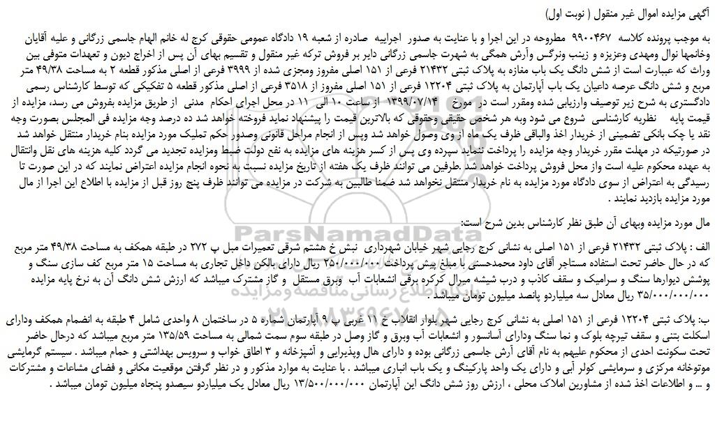 به موجب پرونده کلاسه 9900467 مطروحه در این اجرا و با عنایت به صدور اجراییه صادره از شعبه 19 دادگاه عمومی حقوقی کرج له خانم الهام جاسمی زرگانی و علیه آقایان وخانمها نوال ومهدی وعزیزه و زینب ونرگس وآرش همگی به شهرت جاسمی زرگانی دایر بر فروش ترکه غیر منقول و تقسیم بهای آن پس از اخراج دیون و تعهدات متوفی بین وراث که عببارت است از شش دانگ یک باب مغازه به پلاک ثبتی 21432 فرعی از 151 اصلی مفروز ومجزی شده از 3999 فرعی از اصلی مذکور قطعه 2 به مساحت 49/38 متر مربع و شش دانگ عرصه داعیان یک باب آپارتمان به پلاک ثبتی 12204 فرعی از 151 اصلی مفروز از 3518 فرعی از اصلی مذکور قطعه 5 تفکیکی که توسط کارشناس رسمی دادگستری به شرح زیر توصیف وارزیابی شده ومقرر است در مورخ 1399/07/14 از ساعت 10 الی 11 در محل اجرای احکام مدنی از طریق مزایده بفروش می رسد، مزایده از قیمت پایه نظریه کارشناسی شروع می شود وبه هر شخص حقیقی وحقوقی که بالاترین قیمت را پیشنهاد نماید فروخته خواهد شد ده درصد وجه مزایده فی المجلس بصورت وجه نقد یا چک بانکی تضمینی از خریدار اخذ والباقی ظرف یک ماه از وی وصول خواهد شد وپس از انجام مراحل قانونی وصدور حکم تملیک مورد مزایده بنام خریدار منتقل خواهد شد در صورتیکه در مهلت مقرر خریدار وجه مزایده را پرداخت ننماید سپرده وی پس از کسر هزینه های مزایده به نفع دولت ضبط ومزایده تجدید می گردد کلیه هزینه های نقل وانتقال به عهده محکوم علیه است واز محل فروش پرداخت خواهد شد .طرفین می توانند ظرف یک هفته از تاریخ مزایده نسبت به نحوه انجام مزایده اعتراض نمایند که در این صورت تا رسیدگی به اعتراض از سوی دادگاه مورد مزایده به نام خریدار منتقل نخواهد شد ضمنا طالبین به شرکت در مزایده می توانند ظرف پنج روز قبل از مزایده با اطلاع این اجرا از مال مورد مزایده بازدید نمایند .