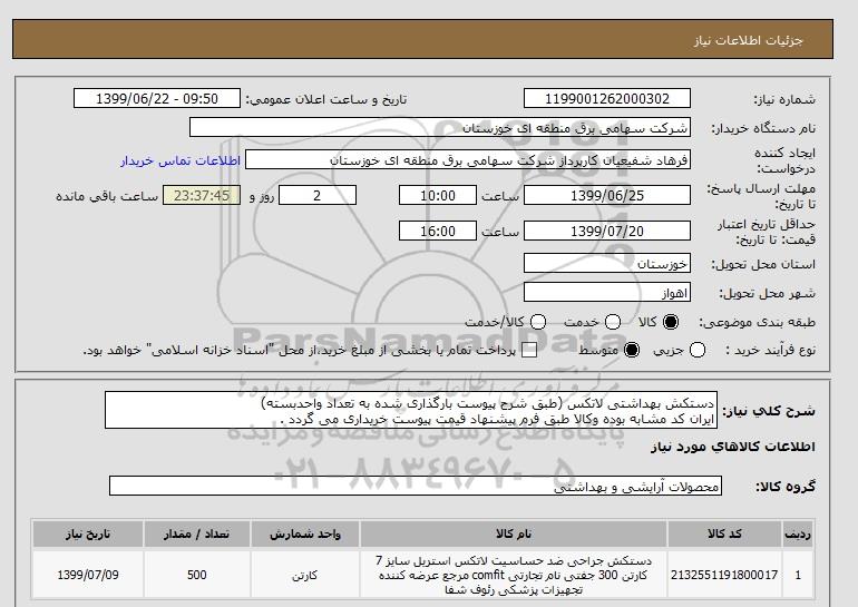شرح کلی نیاز: دستکش بهداشتی لاتکس (طبق شرح پیوست بارگذاری شده به تعداد واحدبسته)