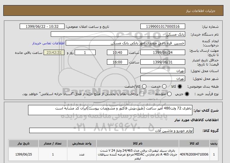 شرح کلی نیاز: باطری 72 ولت480 آمپر ساعت (طبق پیش فاکتور و مشخصات پیوست)ایران کد مشابه است