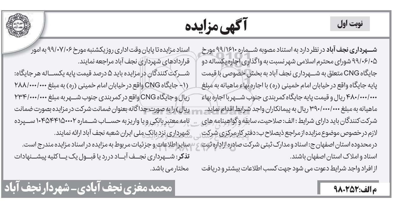 شهرداری نجف آباد در نظر دارد نسبت به واگذاری اجاره یکساله دو جایگاه CNG متعلق به شهرداری نجف آباد به بخش خصوصی با قیمت پایه جایگاه واقع در خیابان امام خمینی با اجاره بها ماهیانه به مبلغ 480.000.000 ریال و قیمت پایه جایگاه کمربندی جنوب شهر با اجاره بها ماهیانه به مبلغ 390.000.000 ریال به پیمانکاران واجد شرایط اقدام نماید