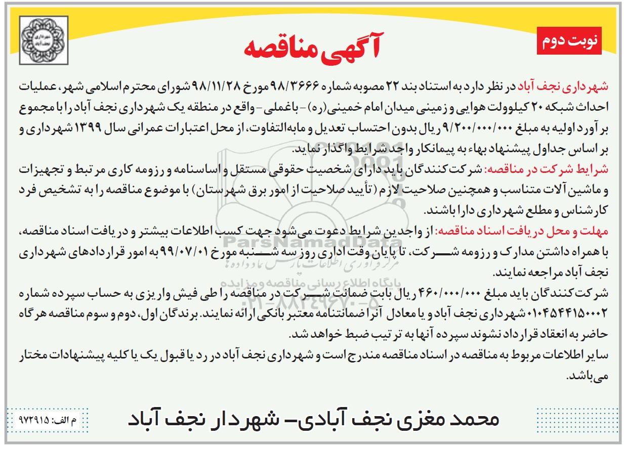 شهرداری نجف آباد در نظر دارد به استناد بندر 22 مصوبه شماره 3666/ 98 مورخ 98.11.28 شورای محترم اسلامی شهر، عملیات احداث شبکه 20 کیلوولت هوایی و زمینی میدان امام خمینی - باغملی واقع در منطقه یک شهرداری نجف آباد را با مجموع برآورد اولیه به مبلغ 9.200.000.000 ریال بدون احتساب تعدیل و مابه التفاوت از محل اعتبارات عمرنی سال 99 شهرداری و براساس جداول پیشنهاد بها به پیمانکار واجد شرایط واگذار نماید