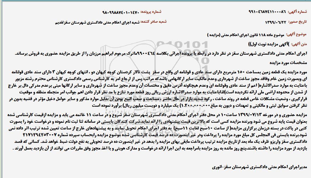 مزایده یک قطعه زمین 150 مترمربع نوبت اول کلاسه 9900464