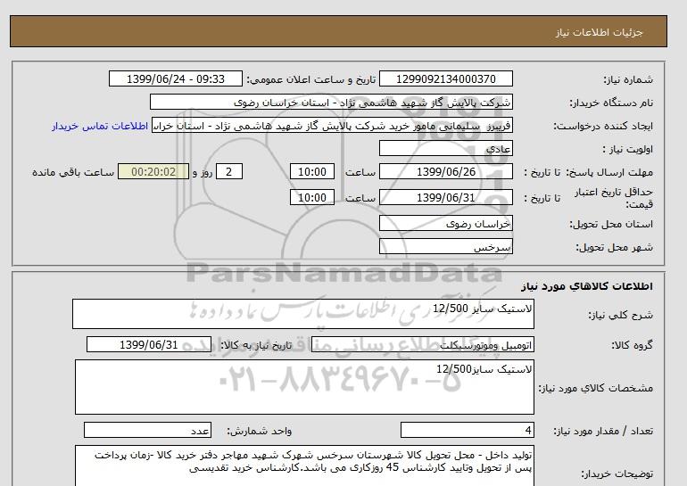 نام دستگاه خریدار:شرکت پالایش گاز شهید هاشمی نژاد - استان خراسان رضوی