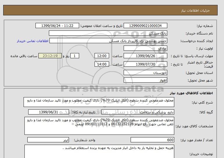 مشخصات کالای مورد نیاز: محلول ضدعفونی کننده سطوح (الکل اتیلیک 70%) داری کیفیت مطلوب و مورد تائید سازمان غذا و دارو تلفن تماس جهت رفع ابهام 06132232128 و 09161111012 لویمی
