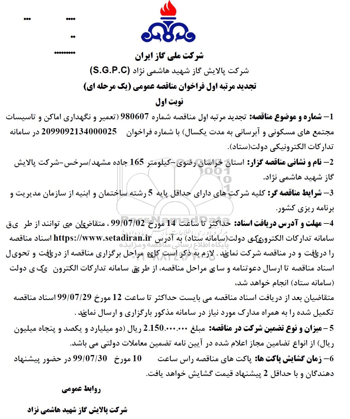 2- نام و نشانی مناقصه گزار: استان خراسان رضوی - کیلومتر 165 جاده مشهد / سرخس - شرکت پالایش گاز شهید هاشمی نژاد