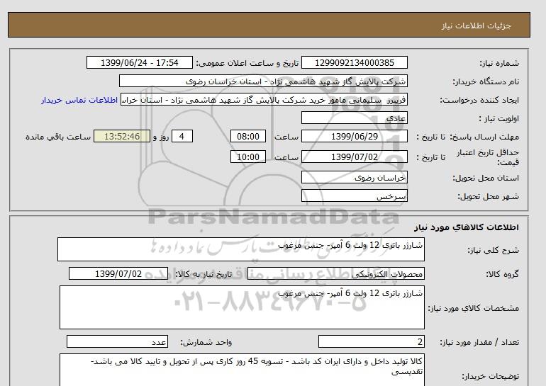 نام دستگاه خریدار:شرکت پالایش گاز شهید هاشمی نژاد - استان خراسان رضوی