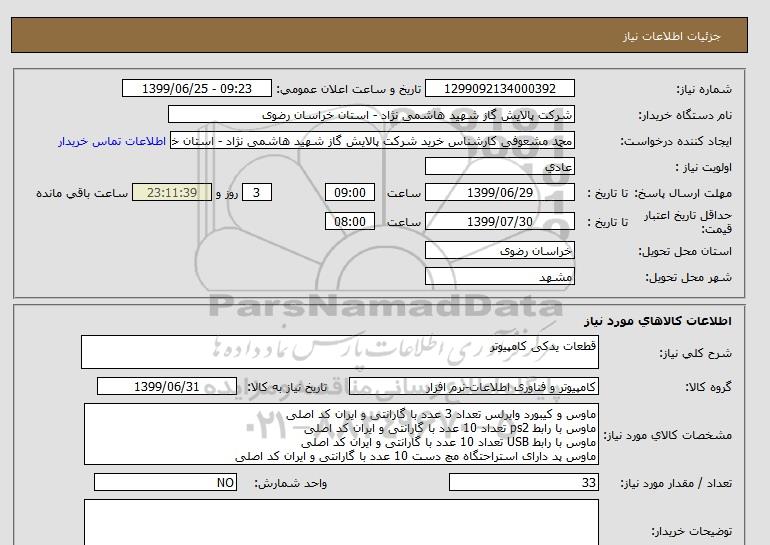 نام دستگاه خریدار:شرکت پالایش گاز شهید هاشمی نژاد - استان خراسان رضوی
