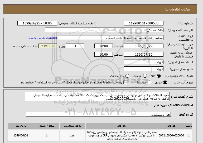 استعلام بها و موضوع استعلام استعلام خرید اتصالات لوله چدنی و بوشن چودنی طبق لیست پیوست کد کالا مشابه می باشد عدم ارسال پیش فاکتور به منزله حذف می باشد26205036 فکس به اطلاع کلیه شرکتها و افراد متخصص واجد شرایط میرساند، آگهی گذار در نظر دارد از طریق استعلام بها، نسبت به انتخاب و دریافت پیشنهادات اقدام نماید. این استعلام با کد آگهی ثبت شده در سامانه خبرگزاری پارس نماد : 2706372 منتشر شده است. مشخصات استعلام : تاریخ شروع استعلام: 1399/06/25 آخرین مهلت ارسال پیشنهاد قیمت : 1399/06/28 و محل اجرای پروژه : استان تهران میباشد. استعلام قیمت مورد درخواست : استعلام خرید اتصالات لوله چدنی و بوشن چودنی طبق لیست پیوست کد کالا مشابه می باشد عدم ارسال پیش فاکتور به منزله حذف می باشد26205036 فکس با دستهبندیهای تخصصی و گروه های مرتبط : تاسیسات ساختمانی, قطعات مس و برنج, لوله و اتصالات, لوله های فولادی و چدنی, استعلام اطلاع رسانی میگردد. شرایط شرکت در استعلام آنلاین : ابتدا ثبت نام در سامانه استعلام پارس نماد و تکمیل مدارک موردنیاز و بارگذاری در سامانه رعایت تمامی ضوابط و الزامات مندرج در اسناد استعلام است.