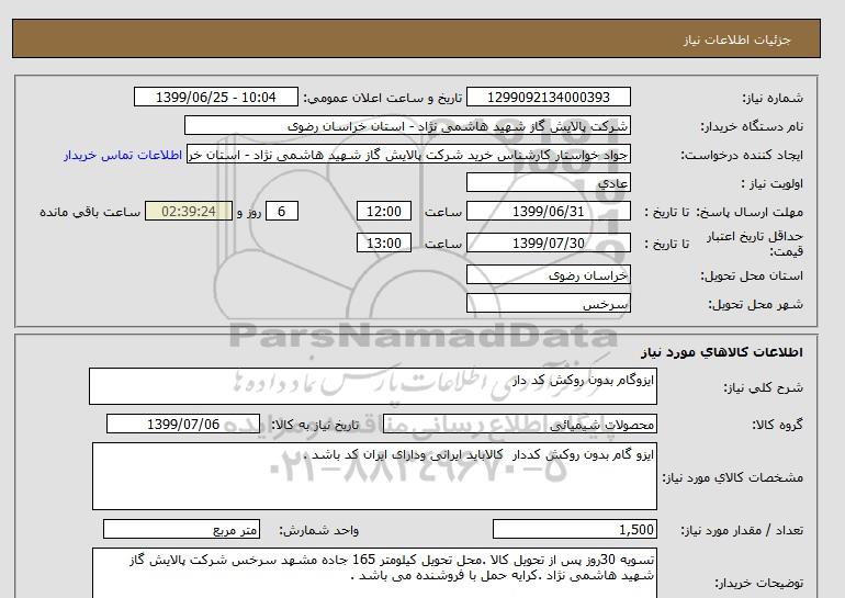 نام دستگاه خریدار:شرکت پالایش گاز شهید هاشمی نژاد - استان خراسان رضوی