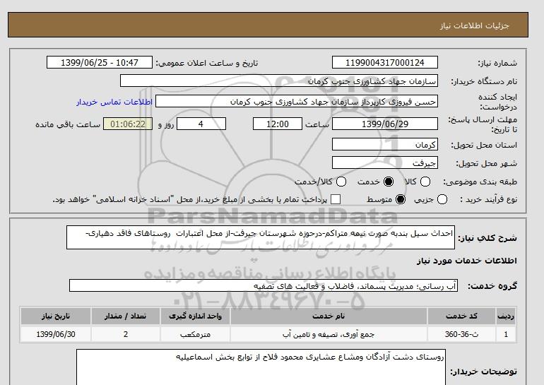 شرح کلی نیاز: احداث سیل بندبه صورت نیمه متراکم-درحوزه شهرستان جیرفت-از محل اعتبارات روستاهای فاقد دهیاری-