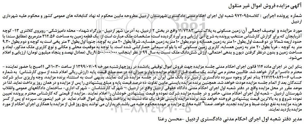 مورد مزایده و توصیف اجمالی آن: زمین مسکونی به پلاک ثبتی 11/7283 واقع در بخش 2 اردبیل، به آدرس: شهر اردبیل- بزرگراه شهداء- محله دامپزشکی- روبروی کلانتری 13- کوچه آذربایجان که برابر گزارش کارشناس منتخب پرونده به شرح آتی ارزیابی و برآورد گردیده است؛ مشخصات ملک عبارت است از: یک قطعه زمین به مساحت 312.56 مترمربع (مطابق سند) با حدود اربعه شمالاً در دو قسمت اول بطول 10 متر به زمین همسایه و دوم بطول 10 متر به زمین همسایه، شرقاً بطول 20 متر به کوچه، جنوباً اول بطول 3 متر پخی است به کوچه و دوم بطول 9.30 متر به کوچه ، غرباً بطول 20 متر به زمین همسایه. کاربری زمین مسکونی که با بلوک سیمانی حصارکشی شده است. با توجه به موقعیت محلی و مکانی و نوع کاربری ملک مذکور، ابعاد و مساحت زمین و بدون درنظر گرفتن دیون و بدهی احتمالی، ارزش شش دانگ ملک نسبت به سال 99 از نظر اینجانب 9/500/000/000ریال (معادل نهصد و پنجاه میلیون تومان) ارزیابی و اعلام می شود.