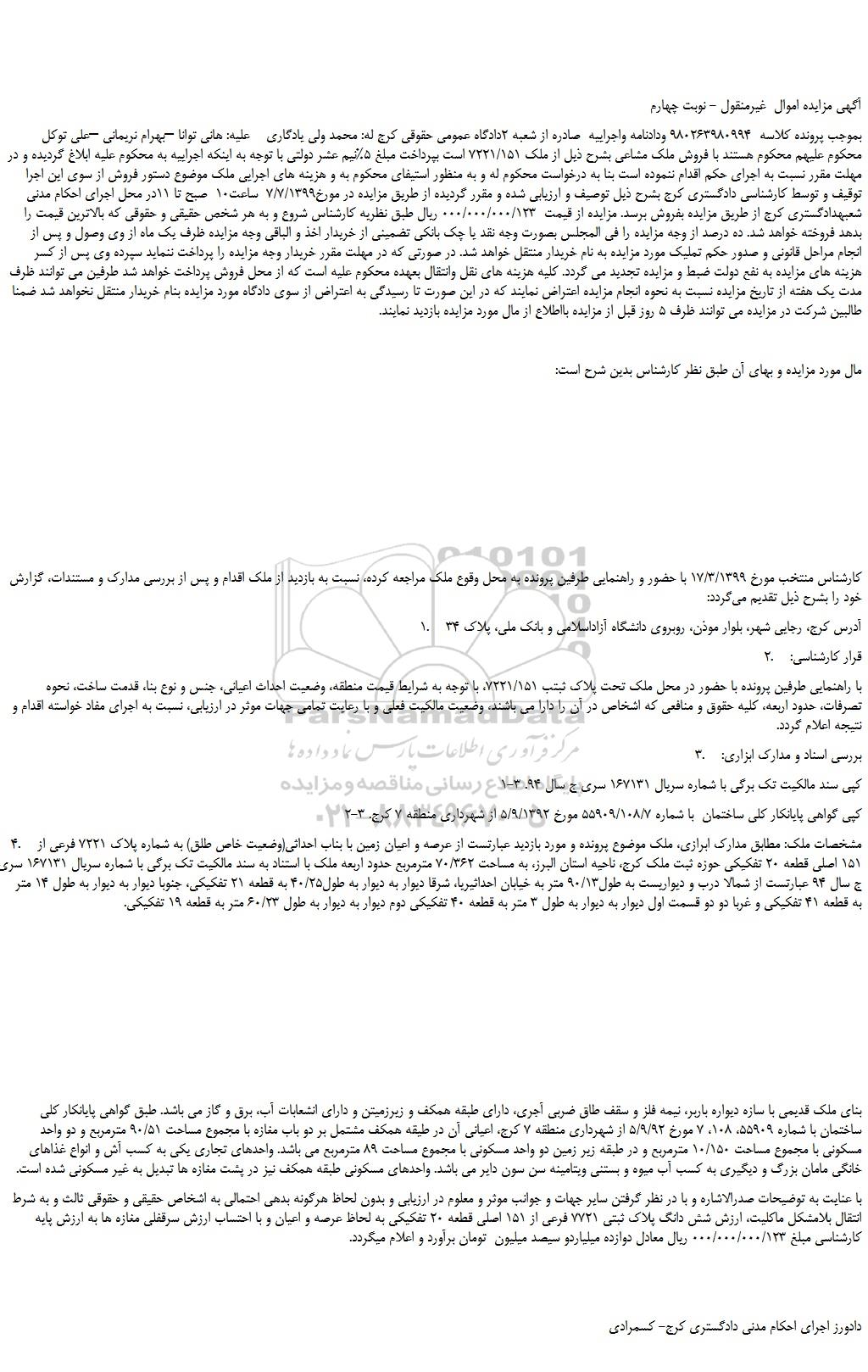 بموجب پرونده کلاسه 980263980994 ودادنامه واجراییه صادره از شعبه 2دادگاه عمومی حقوقی کرج له: محمد ولی یادگاری علیه: هانی توانا –بهرام نریمانی –علی توکل محکوم علیهم محکوم هستند با فروش ملک مشاعی بشرح ذیل از ملک 7221/151 است بپرداخت مبلغ 5%نیم عشر دولتی با توجه به اینکه اجراییه به محکوم علیه ابلاغ گردیده و در مهلت مقرر نسبت به اجرای حکم اقدام ننموده است بنا به درخواست محکوم له و به منظور استیفای محکوم به و هزینه های اجرایی ملک موضوع دستور فروش از سوی این اجرا توقیف و توسط کارشناسی دادگستری کرج بشرح ذیل توصیف و ارزیابی شده و مقرر گردیده از طریق مزایده در مورخ7/7/1399 ساعت10 صبح تا 11در محل اجرای احکام مدنی شعبهدادگستری کرج از طریق مزایده بفروش برسد. مزایده از قیمت 000/000/000/123 ریال طبق نظریه کارشناس شروع و به هر شخص حقیقی و حقوقی که بالاترین قیمت را بدهد فروخته خواهد شد. ده درصد از وجه مزایده را فی المجلس بصورت وجه نقد یا چک بانکی تضمینی از خریدار اخذ و الباقی وجه مزایده ظرف یک ماه از وی وصول و پس از انجام مراحل قانونی و صدور حکم تملیک مورد مزایده به نام خریدار منتقل خواهد شد. در صورتی که در مهلت مقرر خریدار وجه مزایده را پرداخت ننماید سپرده وی پس از کسر هزینه های مزایده به نفع دولت ضبط و مزایده تجدید می گردد. کلیه هزینه های نقل وانتقال بعهده محکوم علیه است که از محل فروش پرداخت خواهد شد طرفین می توانند ظرف مدت یک هفته از تاریخ مزایده نسبت به نحوه انجام مزایده اعتراض نمایند که در این صورت تا رسیدگی به اعتراض از سوی دادگاه مورد مزایده بنام خریدار منتقل نخواهد شد ضمنا طالبین شرکت در مزایده می توانند ظرف 5 روز قبل از مزایده بااطلاع از مال مورد مزایده بازدید نمایند.