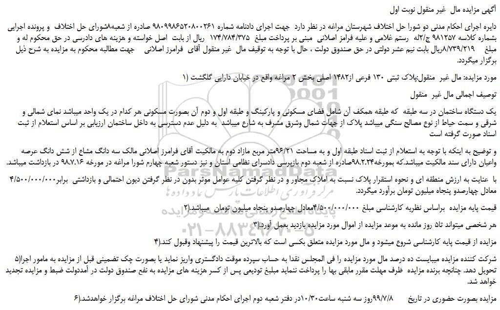 دایره اجرای احکام مدنی دو شورا حل اختلاف شهرستان مراغه در نظر دارد جهت اجرای دادنامه شماره 9809986520800261 صادره از شعبه8شورای حل اختلاف و پرونده اجرایی بشماره کلاسه 981257 ج/2له رستم غلامی و علیه فرامز اصلانی مبنی بر پرداخت مبلغ 174/784/375 ریال از بابت اصل خواسته و هزینه های دادرسی در حق محکوم له و مبلغ 8/739/219ریال بابت نیم عشر دولتی در حق صندوق دولت ، حال با توجه به توقیف مال غیر منقول آقای فرامرز اصلانی جهت مطالبه محکوم به مزایده به شرح ذیل برگزار میگردد.
