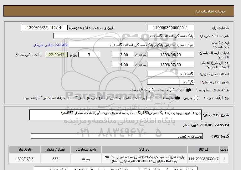 شرح کلی نیاز: پارچه تترون بروجرددرجه یک عرض150رنگ سفید ساده به صورت قواره شده مقدار 857متر/